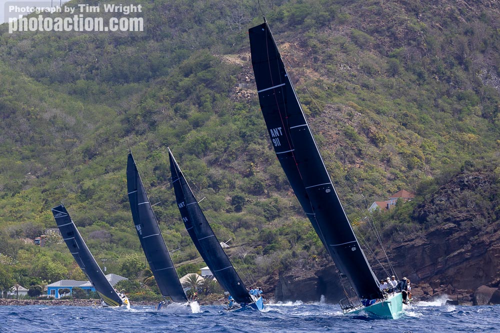 RP37 Warthog leading the fleet upwind along Antigua’s rugged coastline (c) Tim Wright/photoaction.com